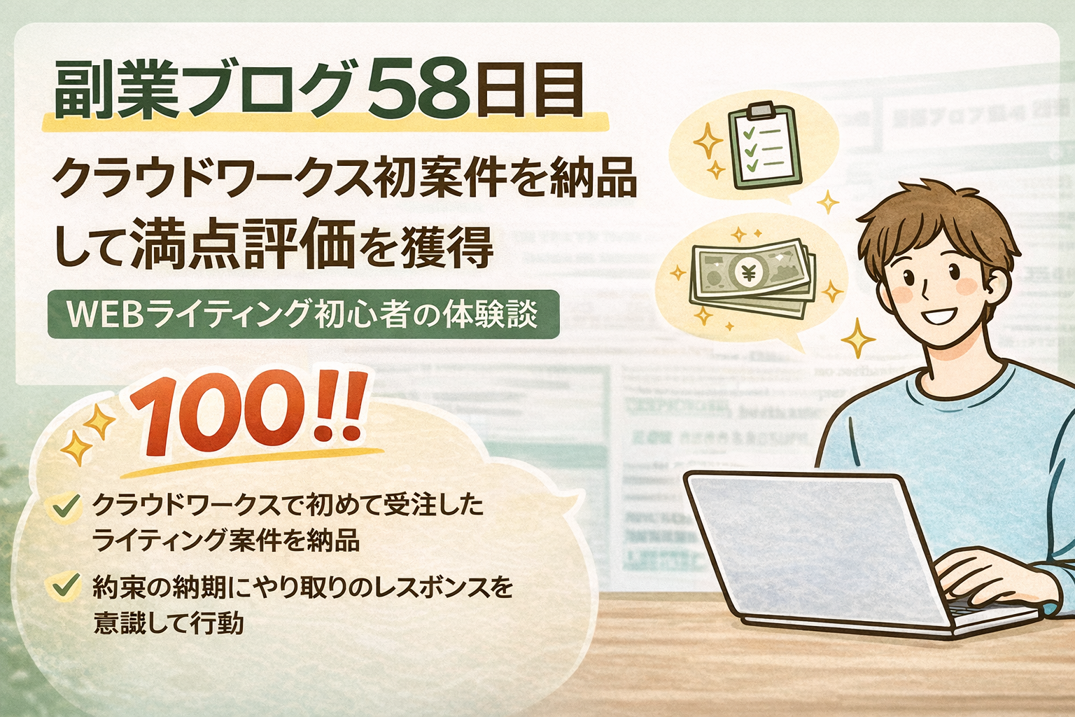 副業58日目で、クラウドワークスの初案件を無事に納品することができました。
