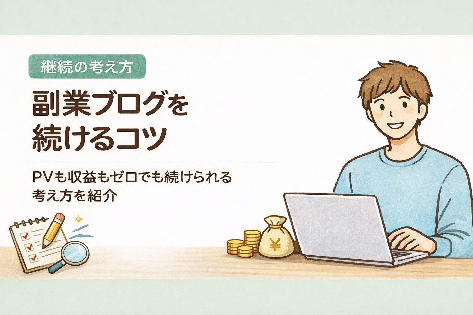 副業ブログを始めたものの、PVも収益もゼロで「このまま続けて意味があるのか」と感じることは少なくありません。この記事では、35歳会社員の自分が、挫折しそうになりながらもブログを続けている理由や、モチベーションだけに頼らない継続の考え方を、実体験ベースでまとめています。