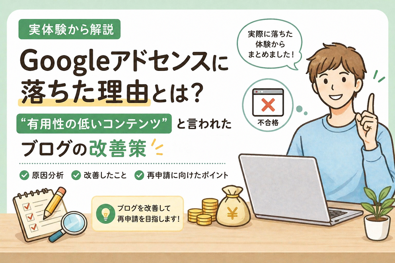 この記事では、実際に副業ブログを運営している私が、アドセンス審査に落ちた理由と改善策をリアルにまとめます。